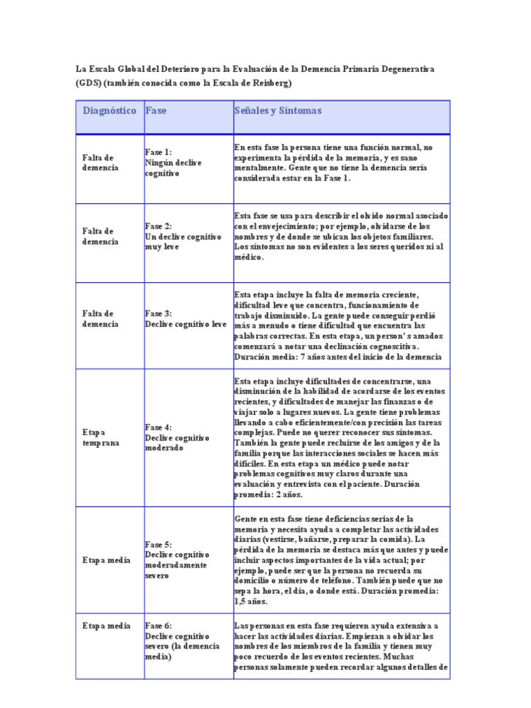 WebEvaluar la fiabilidad de la Escala Global de Deterioro (GDS), realizada mediante entrevista telefónica, para graduar el deterioro cognitivo. Método Estudio prospectivo en el que. WebEscala de deterioro global de Reisberg (GDS) La siguiente división por fases sirve como guía para entender el progreso de la enfermedad, para ayudar a los cuidadores a. WebFases evolutivas de una demencia degenerativa. Escala de deterioro global (GDS) Estadio Fase clínica MEC Comentarios GDS 1 Ausencia de déficit cognitivo Normal 30-35• No.