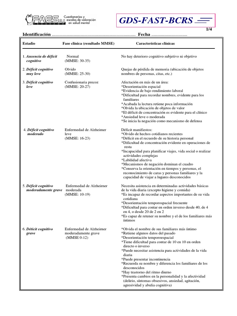 WebEscala de deterioro global (GDS) Global Deterioration Scale (Escala de deterioro global) de Reisberg GDS-1, ausencia de alteración cognitiva (Miniexamen cognoscitivo -MEC- de. WebESCALA DE DETERIORO GLOBAL (GDS) (Reisberg et al., 1982) Y EVALUACIÓN DEL ESTADO FUNCIONAL (FAST) ( Reisberg et al., 1988) Tomado de Peña et al. (2004).. WebLa Global Deteriorarion Scale tuvo una buena correlación con Clinical Dementia Rating (r de Spearman =0,97; P=0,0001). La sensibilidad de la escala para establecer estadio de. WebESCALA DE DETERIORO GLOBAL (GDS-FAST) Estadio Fase clínica Características FAST Comentarios GDS 1. Ausencia de déficit cognitivo Normal MEC: 30-35 Ausencia. WebESCALA REISBERG DE DETERIORO GLOBAL. NOMBRE_____FECHA_____EXAMINADOR_____ ETAPA 1 NORMAL. Sin deterioro. WebGDS 3, defecto cognitivo leve. MEC de Lobo entre 20 y 27 puntos. Se corresponde con el deterioro cognitivo leve: Primeros defectos claros: manifestaciones en una o más de. WebEvolución de la Cognición y la relación de las funciones cotidianas de una persona de edad adulto mayor.