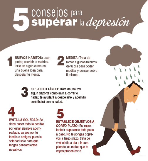 WebCómo salir de una depresión grave. El primer paso para salir de esta situación es detectar en qué estado está tu mente y en qué nivel afecta la depresión. WebSi necesitas desconectar y de momento te agobia salir de casa, sin salir de casa, visita el foro, lee hilos donde te animes, no leas nada de noticias etc ,referente a lo. Webmira que la familia y la salud vale mas que todo, piensalo y no te dejes dominar por ti misma, salte a la calle cuando te vengan los malos pensamientos quizas. WebPrimero debes entender que lo que te pasa no tiene que ver con nada externo. La depresión no depende de lo que te haya pasado sino de cómo te enfrentas. WebA continuación, te indicamos algunos consejos que puedes seguir para saber cómo salir de una depresión. 1. Ve a terapia. Es muy importante que te pongas en manos de un. WebEvita el encierro, desahogarte y compartir es parte de la solución. 4. El chocolate es uno de los alimentos que ayuda a salir de una depresión, ya que es rico en. WebFormas de superar la depresión. 1. Ejercicio físico: Anda a paso ligero de 15 a 30 minutos, baila, corre o monta bicicleta esto te ayudara en tu estado de animo. 2. Cuídate.