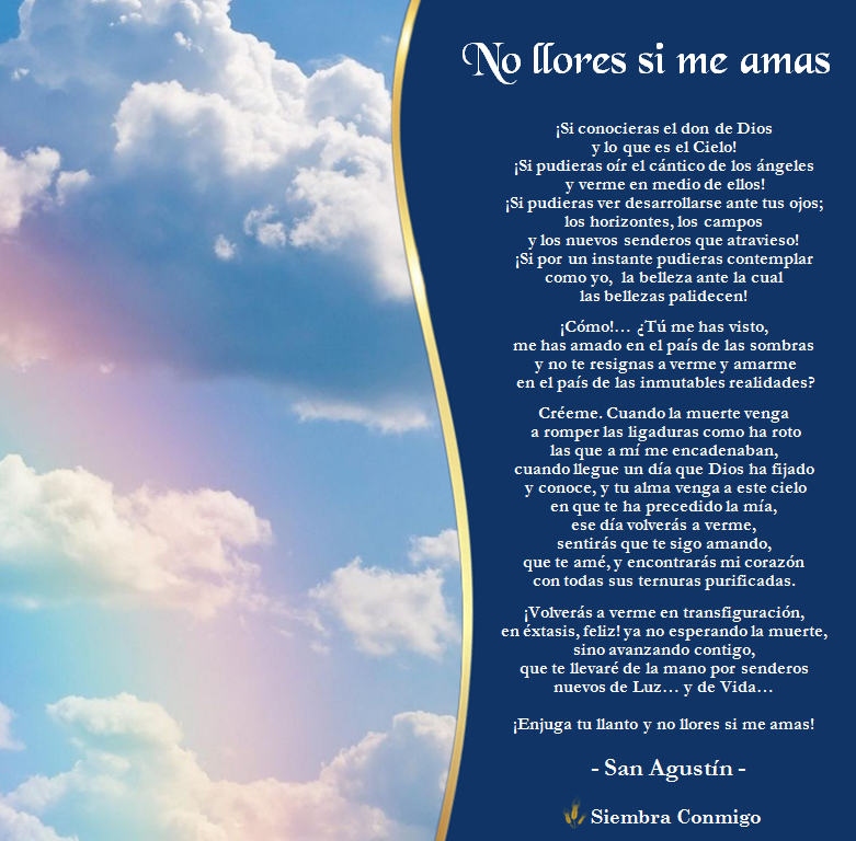 WebCuando me haya ido. No estés triste, no llores... recuérdame. Me gusta Compartido Traducir. Más. Denunciar; Descargar; Incrustar; Redes sociales. Editar publicación .. WebLa muerte no es el final de Agustín de Hipona. La muerte no es nada, sólo he pasado a la habitación de al lado. Yo soy yo, vosotros sois vosotros. Lo que somos unos para los. WebSe titula «no llores si me amas». La supuesta carta de San Agustín sobre la muerte. Circula por la red una carta, bajo la rúbrica de San Agustín, en la que un.