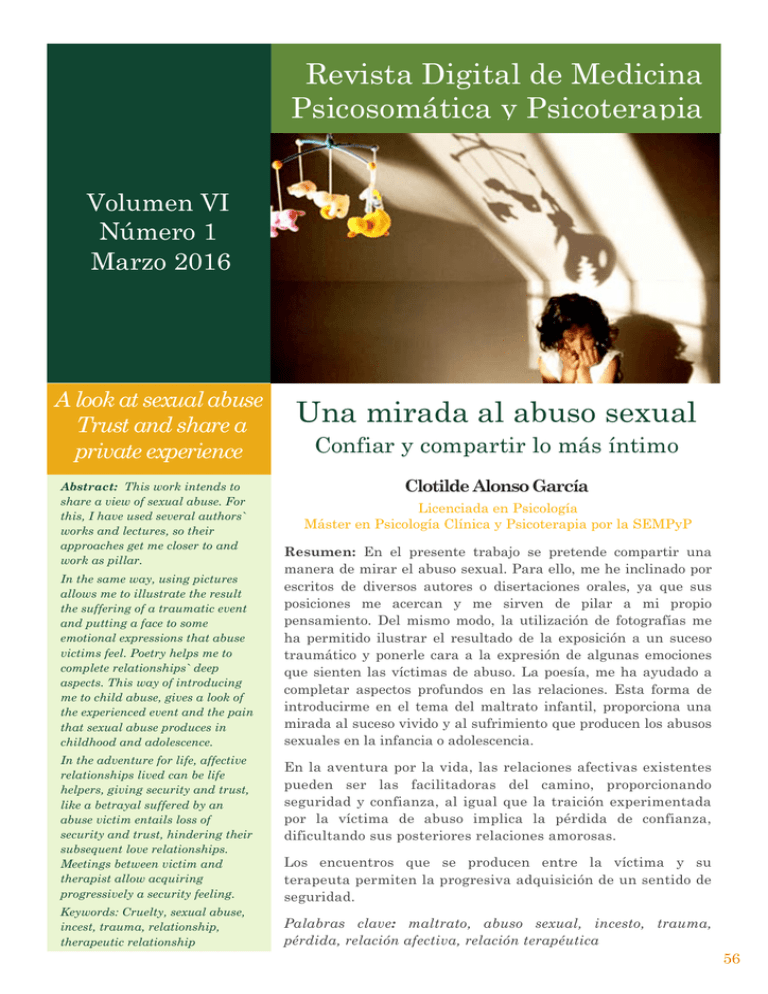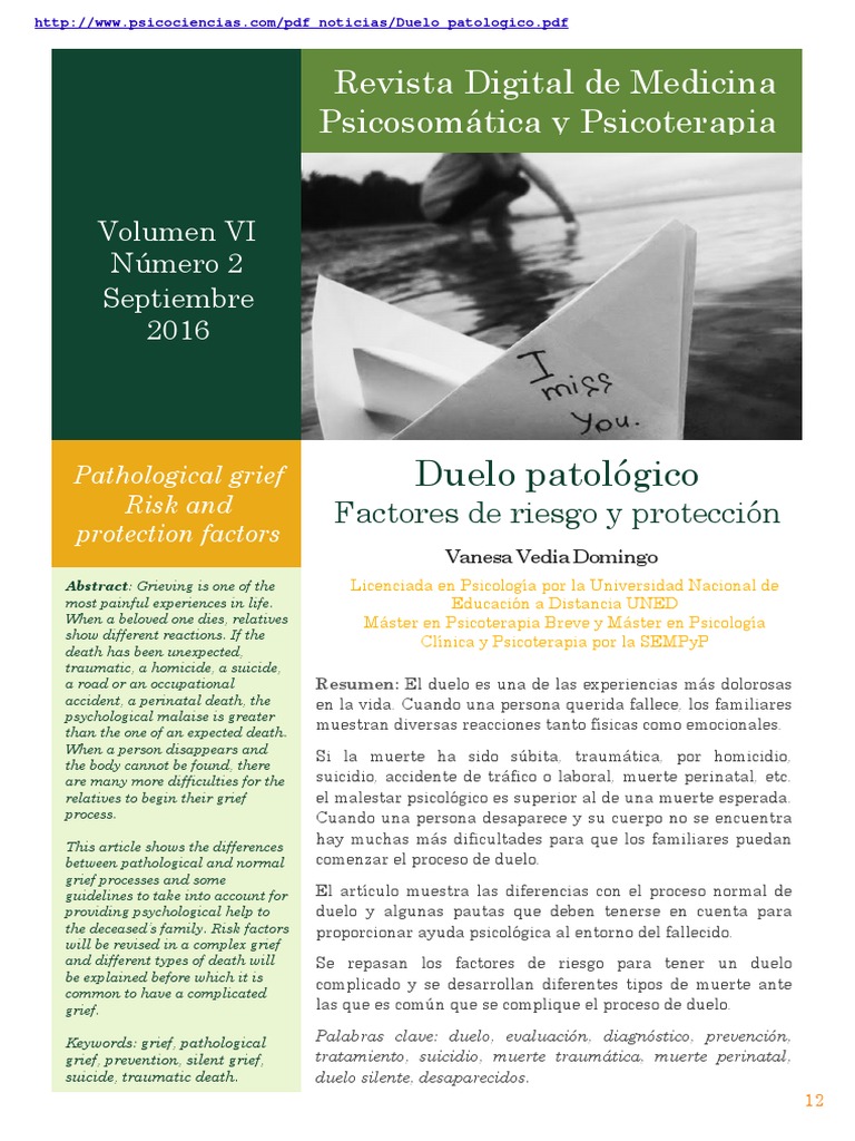 WebRevista Digital de Medicina Psicosomática y Psicoterapia Differential effects of trauma in fibromyalgia Volumen VI Número 3 Abstract: This paper aims to analyze the study of trauma in fibromyalgia. For this, in the first part we present an analysis of the different papers that in recent years have analyzed the possible differential WebRevista digital de medicina psicosomática y psicoterapia I-faktoren 2022-2023| Analyse, Trend, Ranking & Forudsigelse - Academic Accelerator Ranking Conference Ranking WebRevista Digital de Medicina Psicosomática y Psicoterapia Vol. VI. Septiembre 2016 Nº 2 INTRODUCCIÓN Horowitz (1980) define el duelo complicado como aquel cuya intensificación llega al nivel en el que “la persona está desbordada, recurre a conductas desadaptativas, o permanece inacabablemente en este estado sin avanzar en