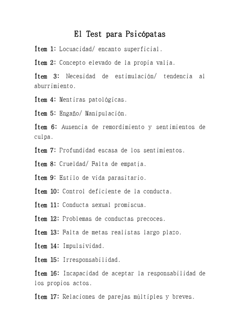 WebSi tienes dudas acerca de si puedes presentar dicho patrón de personalidad, puedes realizar este test psicológico de sociopatíapara saber si eres. WebHaz este test para saber si eres un psicópata. Todo psicópata posee ciertas características personales y emocionales que le hacen relacionarse con el resto y consigo mismos de. Web¿Eres un sociópata? Recuerda contestar con sinceridad; no pienses demasiado en las respuestas. Descubre si tienes inclinaciones antisociales. Facebook. WebEl Test de Rorschach para saber si eres un psicópata. El test de Rorschach fue ideado y publicado en 1921 por el psiquiatra y psicoanalista suizo Hermann. WebEl sociópata es un término informal que suele utilizarse para referirse a las personas afectadas por el Trastorno Antisocial de la Personalidad (TAP). Estas. Web¿que tan FURRO eres? COMENZAR. Eres mente sucia o limpia. COMENZAR ¿Eres uke, seme o suke? 7w7. COMENZAR ¿Cielo o infierno? COMENZAR. Das cringe?. WebExisten varios test y cuestionarios en línea a los que puede acceder para determinar si es un psicópata o un sociópata. Estos cuestionarios generalmente se basan en una lista de. WebLos sociópatas son manipuladores y estafadores, carecen de empatía y tienen una conciencia débil que les permite actuar de manera imprudente o agresiva, incluso.